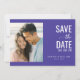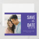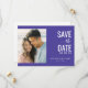 Denna bröllops-kort för att spara datumet har en modern och minimalistisk design med en delad layout. Den vänstra sidan visar en platshållare för ett strand-temat foto, medan den högra sidan är fylld med en djup lila-blå bakgrund som framhäver elegant typografi. En kombination av feta sans-serif- och kursiva teckensnitt tillför visuellt intresse och skapar en glad och inbjudande stämning som är perfekt för att tillkännage er speciella dag. Den harmoniska färgpaletten inkluderar mjuka blågröna och dämpade peach-toner som förstärker den övergripande estetiska tilltalande.