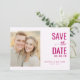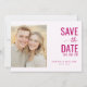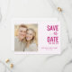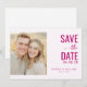 Denna bröllops-karta för att spara datumet har en delad layout med ett mjukt foto av två individer till vänster, mot en varmtonad utomhusbakgrund. Den högra sidan visar fet magentatext i en modern sans-serif-teckensnitt, i kombination med elegant skrivstil för namnen, vilket skapar en glad och inbjudande stämning. Designen balanserar enkelhet och sofistikation genom att effektivt använda negativt utrymme för att framhäva viktiga detaljer. Perfekt för par som vill dela sin speciella stund med vänner och familj, kombinerar detta kort samtida stil med personliga detaljer.