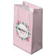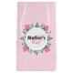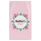 Glad mors dag presentpåse dekorerad med rosa tulpaner, vita små blommor och gröna blad.