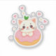 Kawaii katt som sitter i en rosa glassad donut med ett litet blad, ler med rosiga kinder, omgiven av stjärnor och hjärtan.