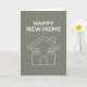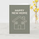 Glad Ny Hem Kort med Hus Grafik med bakgrund i Varm eukalyptus - Pantone årets färg. Ett modernt ny hem kort.
