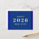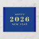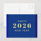 Glad nyår-vykort med blå färger och guldbokstäver. Perfekt för dem som söker vykort för att fira det nya året. Trevliga blå färger. Anpassad text på framsidan och baksidan av kortet. Använd mallen för att skapa ditt eget anpassade Glad nyår-vykort.