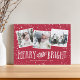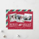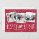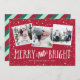 Festlig julkort med tre fyrkantiga bilder i en kollage layout, med "glad och ljus" i fantasifull vit text på röd bakgrund. Anpassa med era namn och året längst ner.