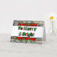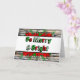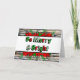 Julstjärna-typografi med Glad och Ljus i rött och grönt och slitna träd bakgrund julkort.