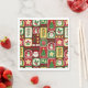 Ett glatt och ljust julmönster med tomte, julgransprydnader, snöman, järnek, stjärnor och mer.