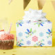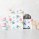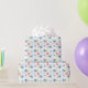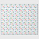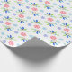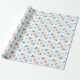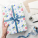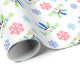 Färgglatt julpapper med vit bakgrund och festligt mönster av snöflingor och julgransbelysning, med grafisk text som lyder Glad och ljus, utförd i ljust grön, blå och röd.