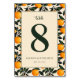 Det här bröllopsbordskortet har en lekfull men ändå elegant design med en central beige rektangel omgiven av ett livfullt mönster av orange frukter och gröna blad. Den djärva, mörkgröna siffran "8" sticker ut mot den mjuka bakgrunden, medan det omgivande citrusmotivet ger ett fräscht och livfullt tillskott. De rena linjerna och platta färgerna ger det en modern grafisk look, perfekt för att tillföra en glad stämning till din händelse. Anpassningsbara textfält låter dig anpassa varje kort utan ansträngning, vilket gör det idealiskt för bröllop eller formella sammankomster.