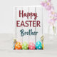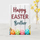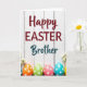 Det här kortet har en säsongsbetonad hälsning mot en rustik bakgrund av gammalt vitmålat trä med vertikala linjer som ger en mjuk struktur. Längst upp står ordet "Happy" i djup karmosinrött, skrivet med flytande kursiv stil, som sedan övergår i "EASTER" med matchande karmosinrött, allt med stora versaler. Strax under står "Brother" med en mörkare teal-färgad kursiv stil, vilket ger layouten en vänlig och nära känsla, som ett varmt meddelande avsett för någon man är glad att ha runt omkring sig. Längs den nedre kanten sitter en prydlig rad äggformer, var och en dekorerad med små vita prickar och fyllda med starka färger som orange, limegrön, mjuk rosa, himmelblå och citrongul 🐰. Små klasar av små vita tusenskönsliknande blommor sticker fram nära äggen och ger en mjuk vårkänsla 🌷. Avståndet mellan orden och dekorationerna känns balanserat, som