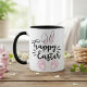 Den här tvåtonade mugg har rosa bunny öron och bunny fot med ord "Glad påsk" i ett svart dekorativt skript.