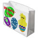 Glad påsk till dig Från Påskhare helgdag presentsäckar för pojkar och flickor i alla åldrar! På baksidan står Hippity-Skutt med söt gult chick som kläckts från dess ägg med blått, lila, grönt, rött, gult rand och dekorerade ägg på framsidan och baksidan av säcken. Designad för vita påsar. Om du väljer en bakgrund klickar färg på Anpassa den och klickar på genomskinlighetsvita. Behållans ordalydelse som den är eller anpassa texten till fält. En sorts presentpåsar för dina speciella Påsk-helgdag-gåvor, eller Påsk födelsedagar för familj och vänner, medarbetare eller grannar till alla åldrar! Om du väljer en annan bakgrund klickar färg på Anpassa den, klickar på Mer och markerar Visa vitt som genomskinligt genom att klicka på Front image lagrar Bunny och Back image lagrar Chick and Lila Egg. Observera att bildens färg ändras något. Originalteckning © 2013, 2016 TamiraZDesigns.