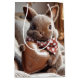 En söt bunny med stort, uttrycksfullt ögon har en hjärtformad choklad som är märkt "I Kärlek You" på en säng. Text kan ändras.