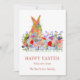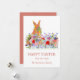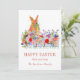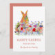 Vattentärliga Påskhare och jägerblommor glad påsk hälsning-kort med terracotta örttoner och typografi. Vackra boho vår-blommigtar, inklusive kornblommor och trädgårdsängor. Modern handmålning i blått, rött, rosa, lila, burgundi, grönt och lavendel. Enkel att anpassa moderna handskriftsskript så att du kan lägga till din familj namn och hälsning. Originalkonstverk av konstnären Catherine Sweetman