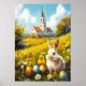 Glad påsk med dessa söta djur som påskhare eller baby chick. Gå med jakten på påskägg i vår med pulserande färg och glädje, godis och en fantasi för vintage av blommigt. Cute-kanin med blommor och en kyrka i bakgrunden.