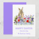 Vattenskort för Påskhare och vildblomma glad påsk hälsning med lila bakåt och typografi. Vackra boho vår-blommigtar, inklusive daisy av kornblommor och trädgårdsängor. Modern handmålning i blått, rött, rosa, lila, burgundi, grönt och lavendel. Enkel att anpassa moderna handskriftsskript så att du kan lägga till din familj namn och hälsning. Originalkonstverk av konstnären Catherine Sweetman