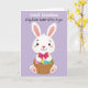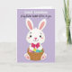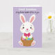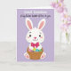 Det här kortet visar en söt, människolik kanin centrerad i bilden, riktad framåt med en mild, vänlig blick 🐰. Kaninen är strålande vit med mjukt rosa innanför de höga öronen, en rodnad på kinderna och rosa på tassarna, vilket ger den en öm, tillgiven närvaro. Runt halsen sitter en överdimensionerad djuprosa rosett, som en söt, presentfärdig detalj som antyder närhet och omtanke. Kaninen håller en rustik flätad korg tätt intill kroppen, som om den erbjöd den till någon speciell på ett varmt, välbekant sätt. I korgen ligger dekorerade påskägg i starka färger som blå, gulgrön och lila, med några prickmönster som tillför extra charm 🌷. Bakgrunden är ett jämnt lavendelfält som håller fokus på kaninen och korgen medan den fortfarande känns mjuk och vårbetonad. Nära toppen står “Great Grandson” i rundade vita bokstäver, med “A big Easter basket of love to you”