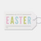 Glad påsk presentkort. Ett modernt tillägg till påskkorgar och presenter. Detta påskpresentkort har en vårpalett av ljusrosa, limegrön och himmelblå med en målad rand som koordinerar mönsterbakgrund och grå snurra.