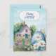 Ett vykort från Glad påsk från ett hem och en varv med ett gigantiskt Påskägg framför omgivet av Daisy. Färgaden ovala och ram kan ändra färg och den text du väljer. Familjetext eller väntext på baksidan.