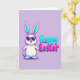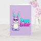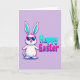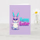 Denna design visar en vit, människo-liknande kanin stående centrerad mot en slät lila bakgrund, leende med mjukt rodnande kinder som om den delar en vänlig, flirtig stund 🐰. Kaninens långa öron är konturerade i het rosa med ljusblå inre örfärg, vilket ger en rolig kontrast mot den lugna bakgrunden. Kaninen bär fuchsia-infattade solglasögon med mörka reflekterande linser som lutar utseendet mot avslappnad självsäkerhet, som om den poserar för någon den gillar. Till höger om karaktären visas orden “Happy Easter” i tjocka, upphöjda bokstäver med mörka konturer och mjuk skuggning. “Happy” är placerad ovanför i akvablå, medan “Easter” sitter nedanför i ljust rosa, som matchar kaninens accenter. Karaktären och bokstä