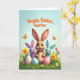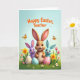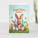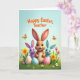 Denna design visar tre kaniner som liknar människor och kikande upp från tjockt grönt gräs, lutande sig nära på ett sätt som känns som nära vänner som delar på ett privat skämt 🐰. Den största kaninen är varm orange med ett brett grin, medan de två mindre följeslagarna - en lavendel och en turkos - lutar sig mot mitten med blanka ögon och mjuka, belåtna leenden. Runt omkring dem fyller vårblommor förgrunden med gula narcissusar, vita prästkragar och rosa tulpaner, med stjälkar och kronblad som överlappar varandra som en mysig trädgårdskant 🌷. Nära deras tassar sitter tre pastella ägg dekorerade med mjuka ränder och små blommiga mönster som ekar de närliggande blommorna. Bakom trion tonar himlen i en jämn övergång från ljust blå högst upp till mintgrön längre ned, och håller scenen luftig och ljus. Två fjärilar med bärnstensfärgade och bruna vingar svävar nära de övre hörnen och balanserar kompositionen med lätt, drivande rö