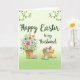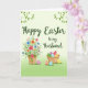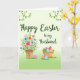 På det här kortet står det ”Happy Easter to my Husband” med mörkgrön text placerad mitt på en blekgrön bakgrund, med små vinrankor som ringlar sig in i de övre hörnen. Under orden känns scenen tillgiven och nära, som om den dukar upp ett lugnt högtidstillfälle mellan två människor. Till vänster sitter en terrakottafärgad kruka som svämmar över av blommande fuchsia, himmelblå, solorange och lila färger insprängda bland gröna blad och några 🥚 inslag. Till höger rymmer en varmbrun skål flera släta äggformade föremål i smaragdgrönt, lavendel, ljusblått och guldgult med ränder, som vittnar om en söt tradition som delas 🐰. Marken tonar fram i mjuka gröna nyanser och ger objekten en mjuk plats att vila på utan hårda linjer. Några extra ägg, några med ränder och några enfärgade, är utspridda i närheten som små överr