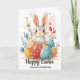 Glad påsk och söta påskharar, ägg och blommor helgkort