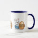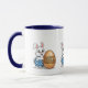 Glad påsk Polka Dot Bunny Mugg. Den berömvärda bunny, klädd i blå och vita prick, hoppade stolt runt och höll ett stort Påskägg som sa "Glad påsk" tittar som om det var redot att starta sin egen helgdag!