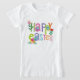 En ljus och glad påskdesign breder ut sig över framsidan av denna vita T-shirt med frasen ”HAPPY EASTER” i lekfulla, flerfärgade bokstäver. Varje bokstav är dekorerad som ett festligt påskägg – randigt, prickigt, mönstrat – och ger en livlig, festlig look. Runt texten finns charmerande vårblommor och lövprydnader i rosa, grönt, lila, orange och gult som ger en frisk och säsongsbetonad touch. Den övergripande känslan är glad, modern och perfekt för att välkomna våren.