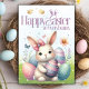 Detta adormerligt söta Påsk-kort har en vit kanin som genomkorsas i en grönt fält och som har ett rosa och lila dekorerat Påskägg med ytterligare fyra färgade ägg som omger henne. På bildtexten ovanför henne står "Glad påsk to all bunny" och det finns ett sött kaninpar öron på "E" i Påsk. Ett par gult-fåglar som flyger ovan slutför scenen. Anpassa genom att anpassa meddelandet på insidan och/eller lägga till ditt/dina namn - eller lämna det tomma fält om du vill lägga till handskrivna namnteckning senare.