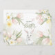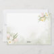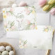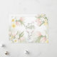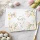 Påsk-hälsningskort med en vattenfärgad blommigt gräns med rosa-, gult-, koffodils-, daisy- och annat vår blommor i hörnen. Mittpunkten har texten "Glad påsk" i ett snyggt, handskrivet skriptteckensnitt med "Lycklig" i versaler och "Påsk" i ett större, flytande kursivt stil. En vit vattenfärgsbunny centrerade en grund och en rosa fjäril flytande i mitten överst. Bakgrunden är ett mjukt vitt, subtilt vattenfärgsliknande grönt, vilket förbättrar den mjuka och festiva tonen i designen. Daffodils- och tulippskonstruktioner och bakgrundsfärgen för vattenfärgen på grönten upprepas med blanksteg för en handskriven anteckning.