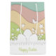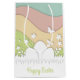 Utformning av papercut i vår, utformning av helgdagar i Påsk, gömt påskägg i ängar, blommor, fjärilar och bin, pastel färg vågar himlar