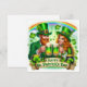 Glad St. Patricks-helgkort med irländsk man och dam som dricker grönt öl, krukor med guld, klöver och en regnbåge