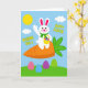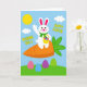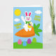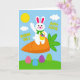 Det här kortet visar en stiliserad vit kanin med rosa accenter på öronen och kinderna, som vinkar vänligt som en trevlig hälsning 🐰. Med den andra armen håller kaninen en liten gul korg fylld med färgglada äggformade godsaker, vilket ger en söt och vänlig delande-känsla. Kaninen sitter på en stor orange morot med bladrika gröna toppar, som om den hittat en mysig sittplats i en vårträdgård. Bakom den syns en ljusblå himmel med en rund gul sol och några mjuka vita moln som driver förbi 🌷. Tvärs över den övre himlen står hälsningen ”WISHING YOU A HAPPY EASTER” i klar gul text, centrerad och lätt att hitta. Längs botten sträcker sig böljande gröna kullar över scenen och håller allt jordnära och lugnt. Spridda på gräset finns överdimensionerade ä