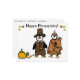 En pingvinpilgrim och infödd amerikan med traditionella höstlöv, pumpor och majs.