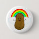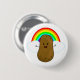 Söt seriepotatis med en stor glad leende i ansiktet. Bakom honom finns en ljus flerfärgad randig regnbåge med fluffiga vita moln i båda ändar.
