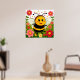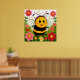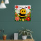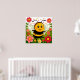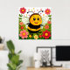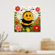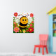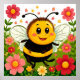 En fantasifull illustration av en leende bi bland blommande färgglada blommor, som fångar naturens charm och glada ögonblick med en touch av serieartad lättsinne.