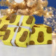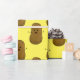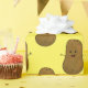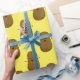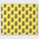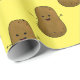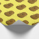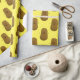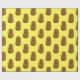 Roligt matförpackningspapper. Ett upprepat mönster av en söt glad seriepotatis med en stor leende på sitt ansikte. Bakgrunden är gul men kan ändras till valfri färg.