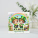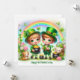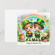 Glad St Patrick's semesterkort med en söt pojke och flicka, guldgrytor, klöver, blommor, djur och en regnbåge