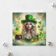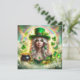 Glad St Patrick Helgdagskort med en dam som bär en Leprechaun-hatt, guldgryte, klöver, fjärilar och en regnbåge