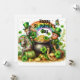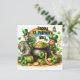 Rolig St. Patricks Day Semesterkort med en Leprechaun, en häst som rider på en häst, en lyckosam hästsko, en gryta med guld, klöver och en regnbåge