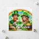Glad St. Patrick's Day Semesterkort med en manlig och kvinnlig Leprechaun som dricker grönt öl en gryta med guld, klöver och en regnbåge