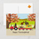 Glad tacksägelsedag Black Labrador Traktor Postkort för Black Labrador Fans! Söt Labrador-familj marscherar med höstens skördade grönsaker i den vackra höstutsikten. Två hästar är deras publik. Skapad av Naomi Ochiai.
