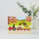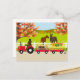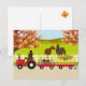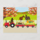 Glad tacksägelsedag Labradors och traktor Postkort för chokladlabrador-fans! Söt labradorfamilj marscherar med höstskördade grönsaker i den vackra höstutsikten. Två hästar är deras publik. Skapad av Naomi Ochiai.