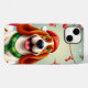 Glad tecknad hund, specifikt en beagle, som bär en röd tomtehatt och en grön halsduk. Hunden har ett brett, lyckligt uttryck, med tungan ute och ljusa ögon. Runt hunden finns färgglada presenter, några inslagna i ljust rött och grönt papper med festliga band. Det finns också dekorativa element som kransar, snöflingor och juldekorationer