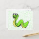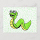 Detta vykort har en glad, tecknad orm som är ljusgrön och gul på en vit bakgrund med livligt gröna prickar.