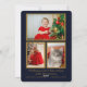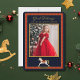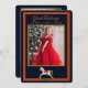 Ge dina hösthälsningar en tidlös charm och sagolik elegans med detta julkort inspirerat av vintage. Framsidan visar en djupblå bakgrund infattad i rikt rött med glittrande gyllene stjärnor, en gammal gunghäst och en plats för ditt familjefoto. Hälsningen "Glad Tidings of His Glorious Birth" är skriven i Gwendolyn Bold och Cormorant SC, vilket ger kortet en varm, nostalgisk men ändå förfinad känsla.