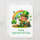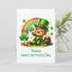 Det här livliga St. Patricks dag-kortet visar en seriefigur-liknande tomte som utstrålar glädje och festlighet. Med sin gröna hatt och en treklöver står han mot en bakgrund av en färgglad regnbåge som leder till en skattkista. Perfekt för att fånga anden av irländsk kultur och firande.