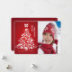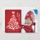 Välbekanta julikoner som snöflingor, klockor, sockerrör, snömannen med mera formar en julgransform som är krönt med ett band mot en strålande röd bakgrund. Ditt favoritfoto fullbordar kortet.