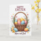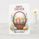 Det här påskkortet visar en flätad brun korg med fin struktur och mjuk skuggning, fylld med dekorativa ovala ägg i milda pastellblå, rosa, gula och orangea nyanser, prickade med små vita prickar. Runt korgen lutar små gröna kvistar och små blommor i rosa och soligt gult inåt som om de samlats ihop med omsorg, vilket ger en mysig och tillgiven känsla 🌷. Några ägg står precis utanför korgen, placerade som om de ställts ned av någon som delar stunden med en nära och kä. Belysningen är mjuk och jämn, vilket ger scenen en lugn och välkomnande look utan hårda skuggor. Nära toppen visas orden “GLAD PÅSK” i versaler i en djup vinröd färg, centrerade ovanför illustrationen. Längst ner står “Mamma och Pappa” skrivet i en flytande kursiv stil