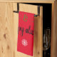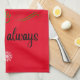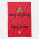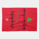 Festiv köksduk med en illustration av en grön julgran med en gul stjärna på toppen, en snöflinga och orden: "glada allt & lycklig alltid" i svart, på röd bakgrund.