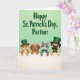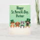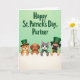 Uppfostrad med fyra seriefigurer i form av husdjur som lutar sig över ett vitt staket, centrerar denna St. Patrick’s Day-illustration kring två katter och två hundar vars närhet och milda leenden antyder en enkel vänskap och en touch av romantik. En orange katt till vänster bär en grön topp hatt och ser ut med ljusa, roade ögon, medan en brun valp bredvid den ler som om de delar ett internt skämt. En slät grå katt i närheten visar upp en grön fluga och har ett lugnt, tillgiven uttryck, och en hjortfärgad hund fullbordar gruppen i en matchande grön topp hatt och fluga, och stirrar framåt med en mjuk, välkomnande blick. Över toppen visas frasen “Happy St. Patrick’s Day, Partner” i stora smaragdgröna bokstäver, som sträcker sig vida och centrerat ovanför karaktärerna. Bakgrunden tonar genom ljusa vårgröna nyanser, vilket får de gröna accessoarerna och meddelandet att sticka ut 💚. Små hö